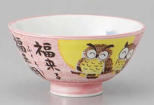 Rosa Reisschale aus Porzellan mit Eulenmotiv