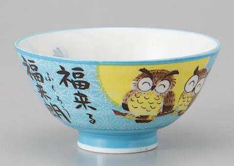 Hellblaue Reisschale aus Porzellan mit Eulenmotiv