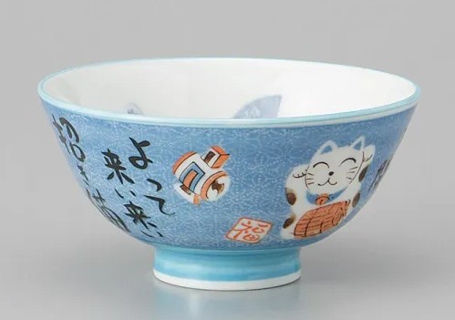 Blaue Reisschale aus Porzellan mit dem Motiv einer Glückskatze