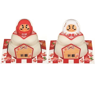 2 runde Reisnudeln in einer Verpackung mit roter oder weißer Daruma-Statue oben für Neujahr