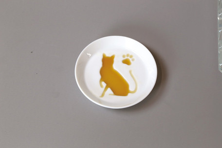 Petite assiette blanche avec chat en relief qui se voit lorsqu’on met de la sauce soja