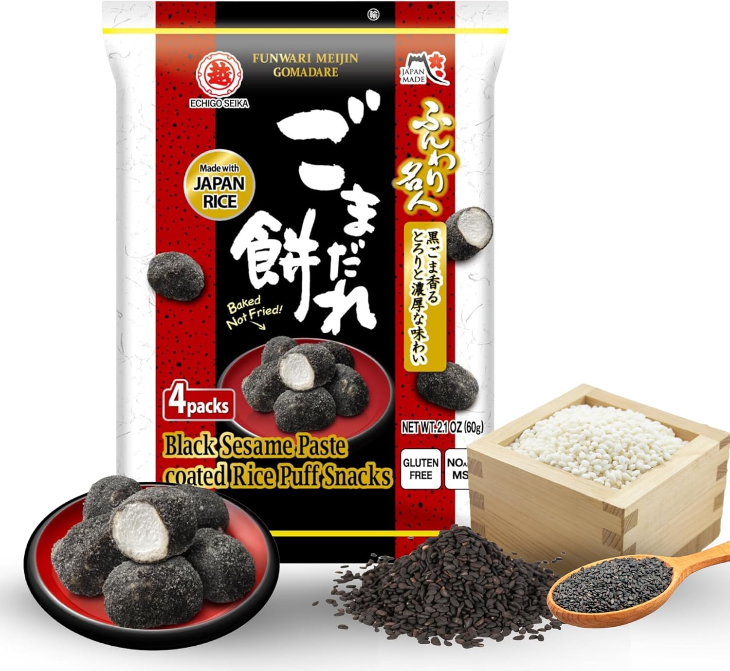 Biscuits de riz au sésame noir sucré, texture croustillante et légère, confectionné avec du riz japonais, SANS GLUTEN