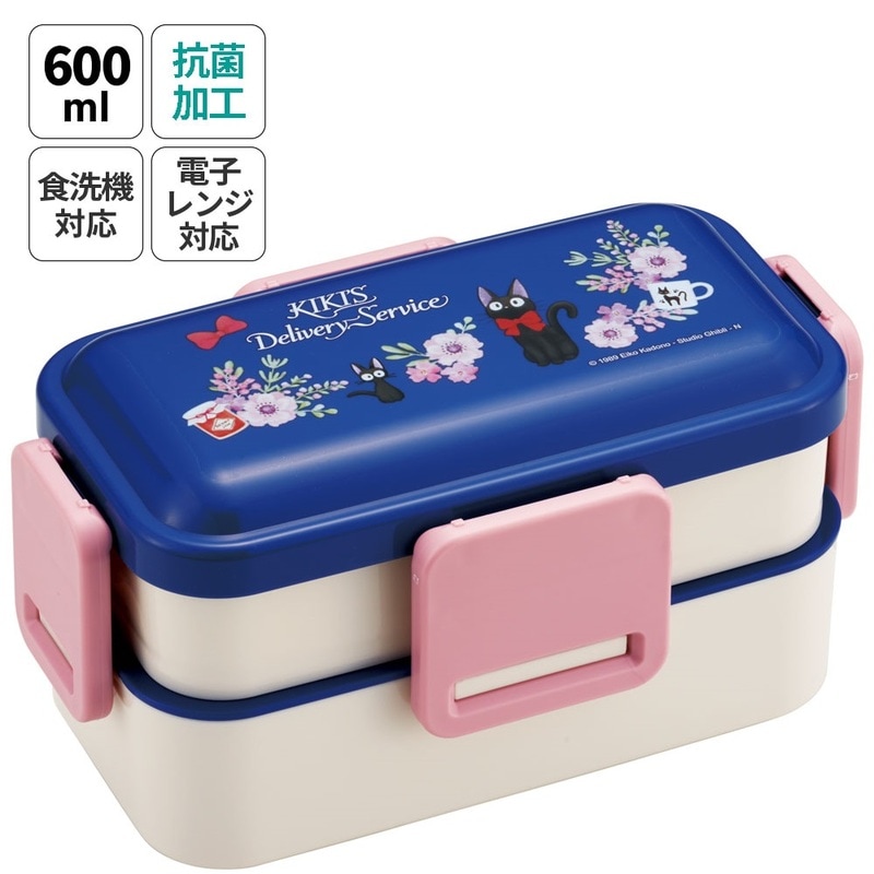 Boîte bento rectangle anti-bactérienne bleue et beige, 2 étages avec motif Kiki Delivery, 4 points de fermeture, 16.9×10×9cm