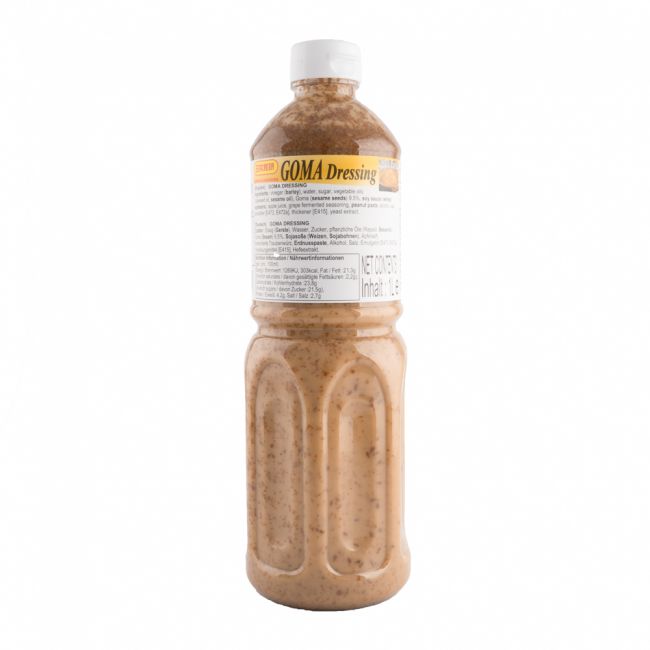 eau, vinaigre d'alcool (eau, riz, alcool, sel, sucre, orge, glucose, extrait de levure), eau sucre, huiles végétales (huile de colza, huile sésame), Goma (graines de sésame) (9.5%), sauce de soja (graines de soja, sel, blé), jus de pomme, assaisonnement fermenté de raisin (eau, raisin, glucose, alcool, riz sek), pâte de cacahuètes, alcool, sel émulsifiant [E473,E472a], épaississant [E415], extrait de levure.