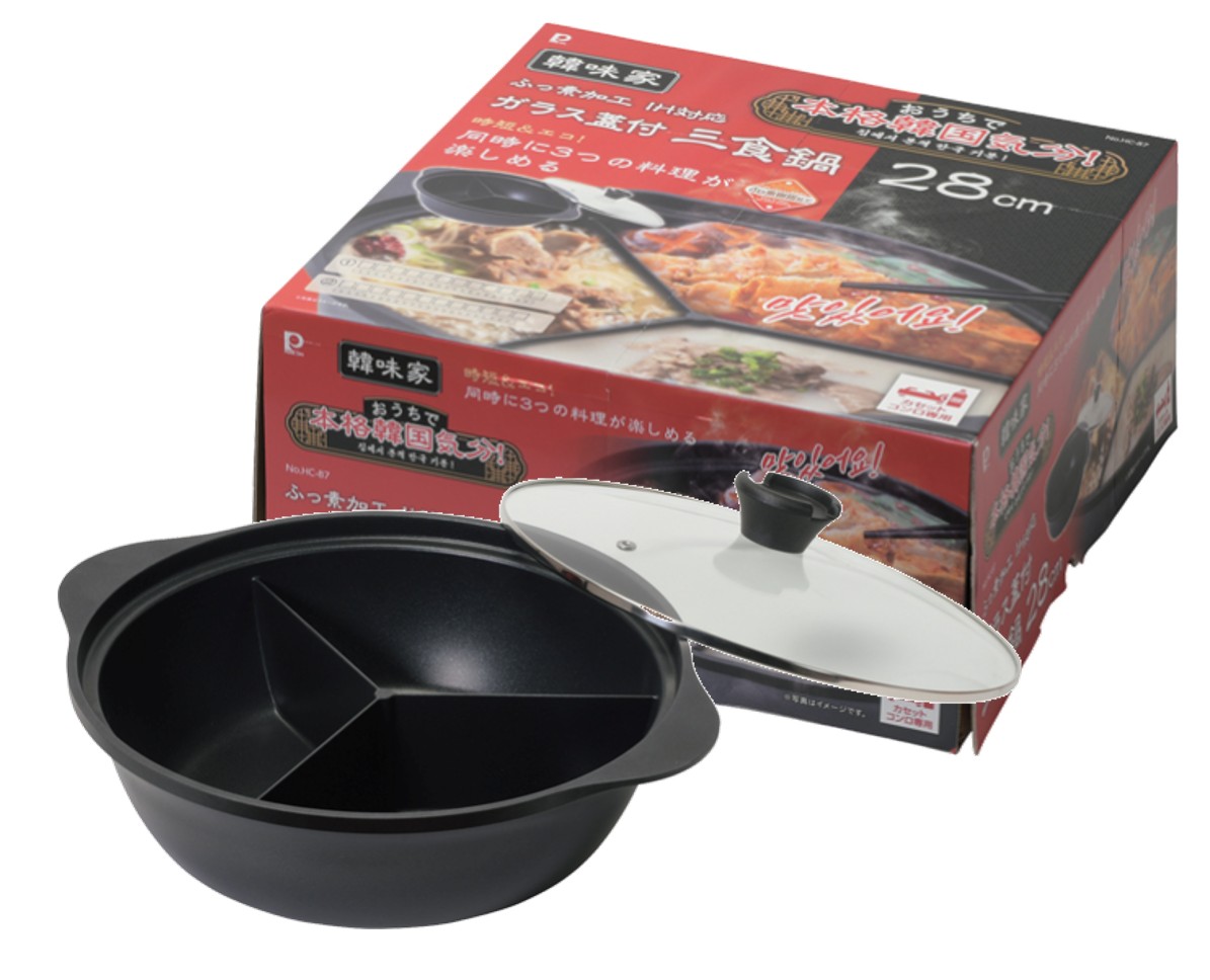 韓味家 ふっ素加工IH対応ガラス蓋付三食鍋28cm
