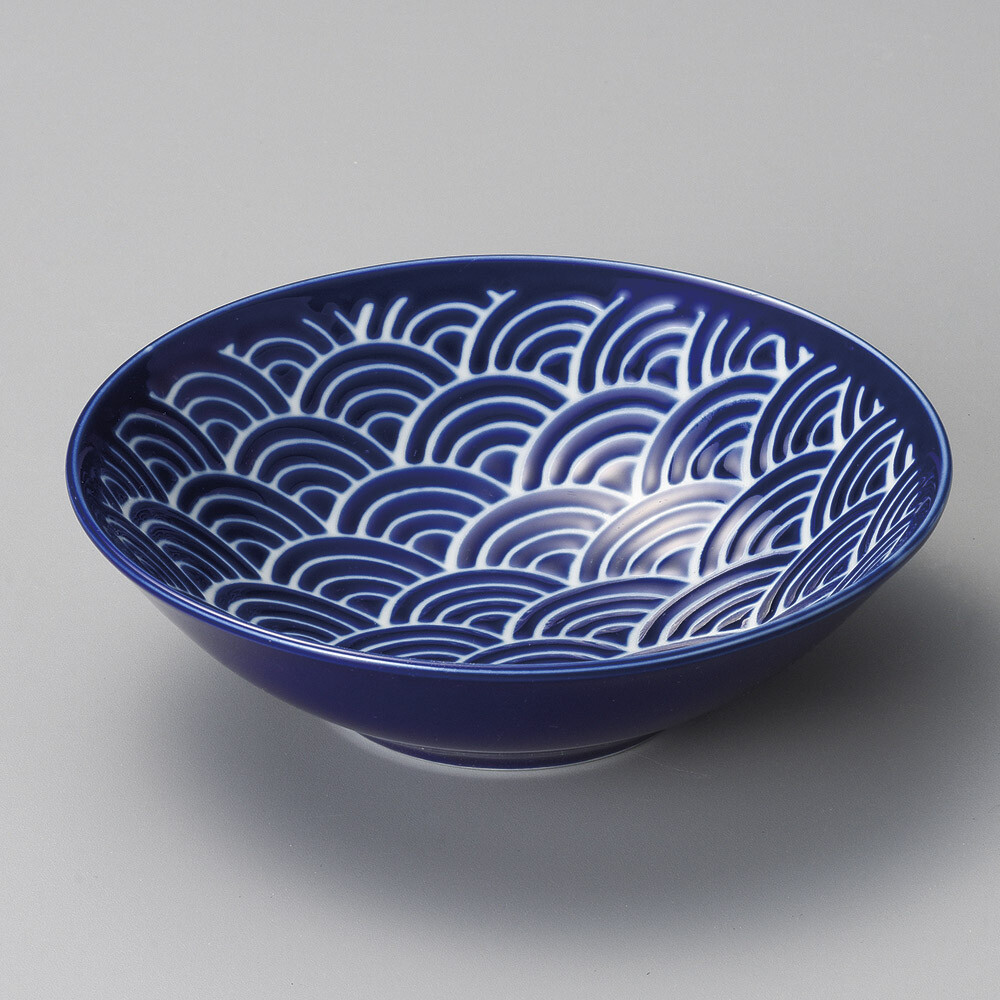 Assiette ronde creuse motif vagues bleues avec bordure bleue
