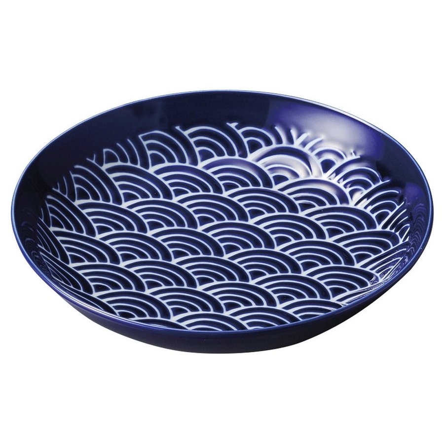 Assiette ronde plate motif vagues bleues avec bordure bleue