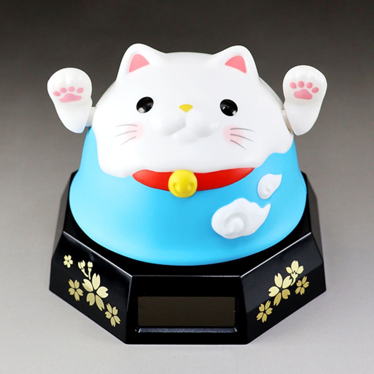 Statue en plastique porte-bonheur de chat blanc en forme du mont Fuji qui bouge (solaire) sur socle noir