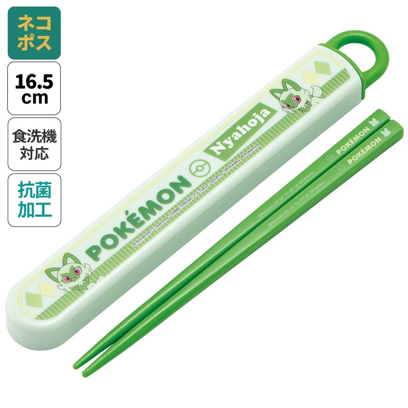Baguettes en plastique anti-bactériennes vertes avec étui coulissant motif Nyahoja de Pokemon