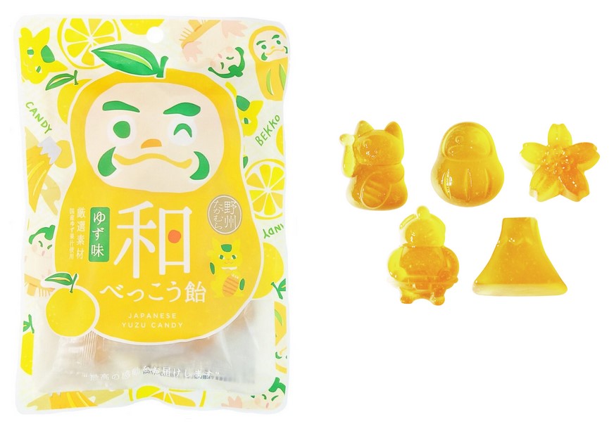 Bonbons au yuzu en forme de 5 motifs traditionnels japonais : chat, daruma, sakura, sumo et Mont-Fuji